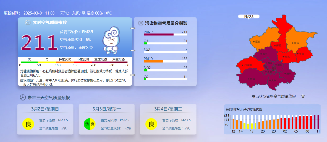 受区域浑浊影响重复不利表象条目下的腹地积攒,本市PM2.5浓度出现显着抬升。2月27日午后达到轻度浑浊,27昼夜间至28日上昼保管轻度-中度浑浊水平,28日午后受日变化影响,浓度短时改善至2级良。28日入夜后,大气领域层着落,加上偏东风带来的区域浑浊回流,3月1日凌晨起,PM2.5再次达到4级中度浑浊水平。3月1日11时,本市PM2.5平均浓度为211微克/立方米。