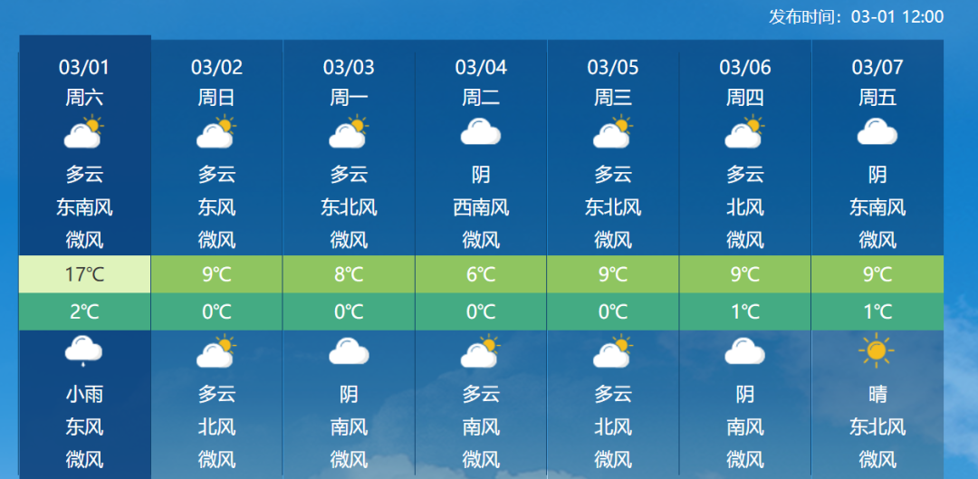 北京市表象台3月1日9时发布:今天白昼多云,有轻雾,北转东风二三级,最高气温16℃;夜间多云转阴有小雨(山区雨转雪),东风一二级转北风三级傍边,最低气温3℃。